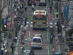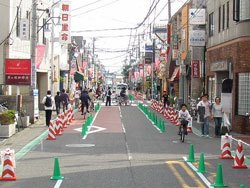 社会実験(平成20年10月実施)の結果、通行帯の区分により交錯が減り利用者の安全性が向上する一方で、歩道、自転車通行帯の幅員不足、搬入車等の駐停車空間の確保が課題となりました。