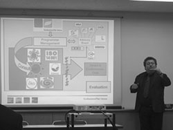 セミナーの冒頭で、小竹先生から今回のセミナーの趣旨説明と講師のトーマス氏(オーストリア・グラーツ市出身の経営コンサルタント)のご紹介をしていただき、その後で、トーマス氏から逐次通訳を含めて約2時間余りご講演をいただきました。報告の柱は、(1)持続可能なマネージメント(考え方~価値観~行動)(2)エコビジネスプランに基づくウィーンでの取り組み事例、(3)アジアでのエコプロフィットアプローチ(フィリピン、韓国など)。