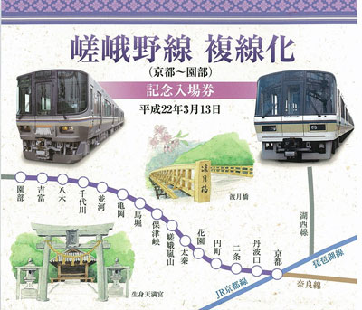 嵯峨野線複線化の記念入場券の台紙(写真 左:223系 右:221系)