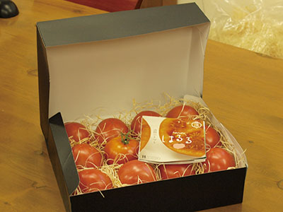 「瑞健」のブランド化にあたって、トマト農家やJA、県、市などをメンバーとする「チームトマト」を結成し、現状の市場分析、流通把握、ライバルとなるトマトの試食など行い、「瑞健」の長所と短所を洗い出した上で、戦略を立てました。その結果、「瑞健」という品種名を尊重しつつ、淡路島の春のイメージや気分を商品価値に加えて新たに発信するために「はるる」というネーミングを打ち出しました。そして、商品全体の評価を高めるために、ギフト用などを目的とし、糖度が高いものを選りすぐった「プレミアム商品」を開発することにしました。写真のような化粧箱に11個入って試験販売価格を1,800円としました。
