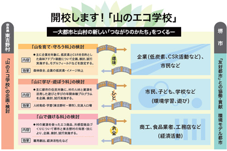 平成21年4月に、東吉野村や堺市、村内の関連団体、奈良交通(株)、アルパック等の企業からなる東吉野村山の学校協議会を設立しました。人口約2,500人の村は吉野林業が主要産業ですが、林業不振もあって40年間で人口が7割減少するなど衰退に歯止めがかかりません。堺市とはかつてホタルを介した交流により友好都市となっており、築100年近くの元小学校の木造校舎を活用した「ふるさと村」という交流施設があり、これらを活かした活性化策を模索していました。一方、堺市は「環境モデル都市」に認定され(全国で13都市)、市域内での取組の他に、友好都市と連携した環境保全や学習の取組も模索していました。そこで平成21年度、内閣府の地方の元気再生事業に採択されたこともあり、東吉野村と堺市のお互いが、win-winの形で環境や経済の問題を解決するための「山のエコ学校」の検討・試行をすることになりました。山のエコ学校とは、上記の旧木造校舎を中心に都市と山村が学び合いながら活動を展開していこうという意味です。図1参照。