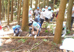 今年の6月5日(土)、晴天の中、コスモ石油(株)堺製油所の社員や子どもも含む家族約110名が、東吉野村(奈良県)に集合しました。これから3年間、約1haの村有林を「コスモの森」として管理することになります。その第1回目の活動日です。午前は、間伐作業や草刈りを、地元の森林組合の指導のもとに行いました。午後は、子どもは清流での鮎のつかみ採り体験、大人は引き続き間伐作業を経て、みんなでバーベキューを囲みます。みなさん非常にいい顔をしています。コスモ石油(株)にとっては、社会貢献が半分、レクリエーションや交流が半分です。そして東吉野村にとっては、森林保全や地域活性化につながります。