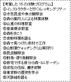 吉野林業はじめ村の資源を使ったエコ商品や共感型商品開発、仕組みづくりについて都市と村の知恵・技等により企画し、試行実施しました。その結果、(1)堺市内の工務店と村の林業者が直接連携することによる東吉野材を活用した住宅づくりのビジネスモデル案、(2)既存の特産品等をブランディングするためのロゴマーク等、(3)東吉野村と堺市の連携をアピールする割り箸(かけ箸)、(4)特産品であるよもぎをつかったボディソープ、(5)東吉野材を使った木育玩具について、考案、試作、販売、提供等を行い、一定の評価は得ました。