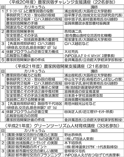 近年、都市農村交流活動やグリーンツーリズムに対する期待が高まり、交流ニーズが多様化する中、平成20~21年度に滋賀県で宿泊を伴う滞在型交流活動の推進と交流プログラムの質の向上を目指した、農家民宿及びグリーンツーリズムに係る人材育成講座が実施され、講座の企画・運営をお手伝いしました。