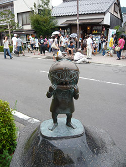 JR境港駅に降り立てば、水木しげるロードと名づけられた約800mの商店街の始まりで、歩道には妖怪をかたどったブロンズ像が130体ばかり並んでいます。ひとつひとつが彫刻家と水木しげる先生の手によって細部までこだわって造られたもので、かわいいものから世にもおそろしげなものまで、表情豊かな妖怪たちです。どの像もどこかしらブロンズがはげてしまって金色にかがやいている部分があるのは、訪れる観光客の多さと、触れられ親しまれている様子を物語っています。