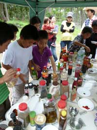 酢、砂糖、塩、みりん、胡椒、ケチャップ、レモン汁、リンゴ酢、唐辛子・・・何十種類もの調味料を使って、自分だけのオリジナルソースを作ります。「エバ○焼き肉のタレ」のように、出来合いのソースではなく、それぞれの素材の味を自分の舌で確かめながら、混ぜ合わせていきます。なかには、何ともいえない色のソースができあがり・・・。