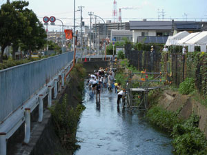 当日は小・中学生の子供たちが、芦田川に入って生き物を捕まえたり、芦田川の水質検査を行った他、プランクトンを顕微鏡で観察したり、竹で水鉄砲を作ったりしました。
