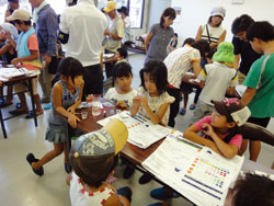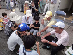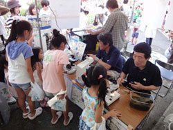 お祭り当日に委員の方々が芦田川に入って捕まえた生き物を“芦田川生き物水族館”として開設した他、“顕微鏡コーナー”を設けたり、七夕にちなんで“笹舟作りコーナー”も設置しました。
