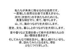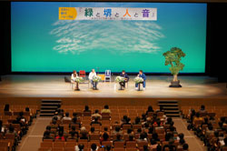 第2部は堺ゆかりのみどりのアーティストが次々と登場、「緑と音」「伝統産業」「地域の伝統文化・自然環境」をテーマに対談を行いました。これらの対談から紡ぎ出された「言の葉」(キーワード)を集め、主催者である堺市都市緑化推進協議会から「さかい緑のメッセージ」を発信しました。