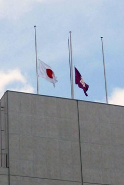 大災害1ヶ月で、多くの公共施設や学校等は元に戻しましたが、京都府庁は「半旗」掲揚を続けています。関西広域連合で、京都府は滋賀県とともに福島県担当と決まっています。下写真は、まだ苦難の日々が続く福島県民の皆さんと、気持ちを共にしていますというしるしです。