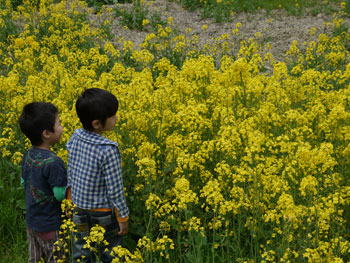 さて、我々が11月に種まきをした畑ですが・・・他の畑より明らかにまばらに咲いておりました。初心者なので、どうしても撒き方が不均一になってしまうのです。大人は苦笑いしながらも、子どもたちは菜の花の中で記念撮影。(斜めから撮ると菜の花が密生しているように見えます)