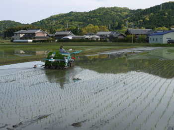 我々が菜の花の観賞を楽しんでいる頃、近くの田んぼでは田植えの真っ最中でした。