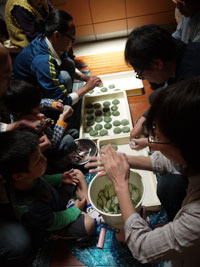 まずは、地元の方のご案内でワラビ採り、タケノコ堀体験などで体を動かした後にうれしいお餅を丸める作業を体験。もうお昼時だったので、丸めながらぱくっと頬ばる甘いあんこの入った草餅はまことに美味しかったです。