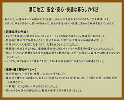 また、ソフト面では、「暮らしの作法」という地域の自主ルールを定め、日々の暮らしのなかでの「お互いさまの関係」を意識した取り組みも行います。