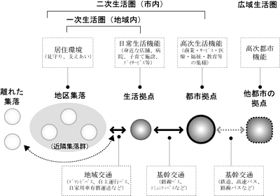 まず、日常生活行動や歴史的経緯、その他地域特性などを考慮して、市町村内外にわたる生活圏域を階層化することが重要です。この際、感覚的ではありますが、住民が「自分のまちだ」と感じられる範囲、つまりコミュニティの広がりを重視することが重要です。身近な暮らしの場である地区・集落を基本単位とし、旧町単位ぐらいを一次生活圏、それらの集合体として市町村域を二次生活圏として設定するのが適切であると考えます。