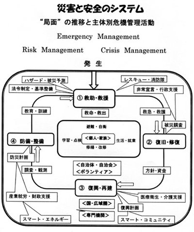 危機管理は、救命・救助から被災調査、復興計画、法令整備或いは教育・学習と繋がって、ぐるぐる回ります。(模式図)