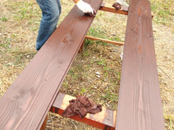 塗料は、酸化鉄の顔料であるベンガラの赤い粉と、松を燃やした煤の松煙という黒い粉を荏油に入れて調合して作った茶色のものです。どれも自然材料で安全です。