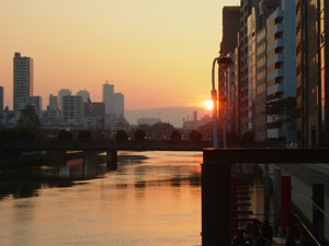 の1週間だけ土佐堀川の向こうに望む生駒の山並みから昇る「ご来光」という自