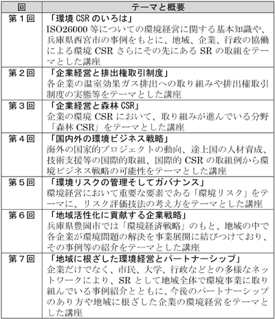 そのような考え方に基づき、具体的には表のように、「環境リスク対策や排出権取引等に関する基礎的知識の習得」、「地域に根ざした企業経営戦略」、さらには「国際的ビジネス展開のための公的機関との連携」までを視野に入れた講座内容として、第一線で活躍されている学識経験者や企業関係者、アジア開発銀行やJICA(独立行政法人国際協力機構)、ICETT(公益財団法人国際環境技術移転センター)などの公的機関や行政の方々に講師になって頂きました。