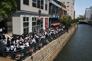 堀川納屋橋界隈では、平成16年の「河川敷地占用許可準則の特例措置(国土交通省)」の通達により河川敷地にオープンカフェ等一定の施設を設置することが可能となったことから、これを活用した遊歩道整備や納屋橋南地区市有地整備活用事業施設の整備等が進められ、少しずつ水辺に顔のある風景が見られるようになってきました。また、今年から名古屋市では「なやばしランブリン(堀川納屋橋地区にぎわい事業)」として、諸条件はあるものの誰もが親水広場や遊歩道でイベント開催が可能となる事業を展開しています。日頃、通勤などで行き交う人の多い納屋橋にあって、ここが堀川再生に向けた大きな舞台となりつつあります。