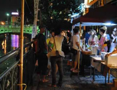 堀川納屋橋界隈ではフラワーフェスティバルをはじめ、一年中、ユニークなイベントが開催されています。例えば、堀川を活かしたまちづくりの意識高揚を図るため開催される「堀川ウォーターマジック」や、産学官の連携により堀川の浄化・美化に貢献できるロボットのコンテスト「堀川エコロボットコンテスト」等です。なかでも、面白いと思うのは、「なやばし夜イチ」。地元の若い方が中心となり、毎月第4金曜の夜に開催されています。手作り看板と赤提灯の先には、飲食ブースから作品展示ブースまで様々なお店が出店され、夜の水辺を楽しむことができます。