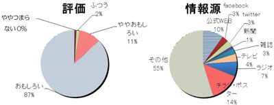 ギアの観客には、客席にアンケート用紙を据え置いて、ご記入をお願いしていますが、この回収率が80%と通常の舞台に比べて格段に高いことが特徴の一つです。しかも、その評価も「おもしろい」が87%、「ややおもしろい」を加えると98%と、たいへん満足度の高い評価をいただいています。こうしたことから、口コミでお客さんがジワジワと広がっているようで、アンケートで「ギアを知った情報源」をお聞きすると、「その他」が55%と圧倒的に多く、その具体内容としては「友達・知人から聞いた」などという記入が多くなっています。