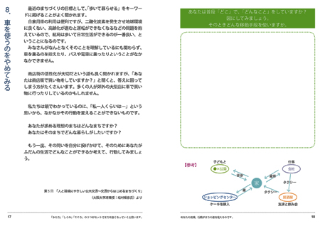 このガイドブックは、市が市民参加プログラムの一環として取り組んだ「西宮まちづくり塾(H21~22年度)」での講演内容をもとに作成されています。様々な分野の先生方の講演内容のエッセンスを盛り込んだページとそれを踏まえたワークブック形式のページがワンセット(見開き2ページ構成)となっています。「読んで書きおこす」というプロセスを通して、私たちの暮らしとまちの関係性について、自然と考えることのできる内容となっています。