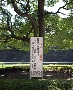 この界隈はもともと観光客も多い場所ですから、混雑する時間帯にはランナーどうしやランナーと歩行者の間で接触や衝突のトラブルも多く問題となっています。このため、ランナーサポート施設等連絡会が「皇居ランナーマナー“10の宣言”」をつくってマナー向上を呼びかけています。皇居ランニングは左側通行で反時計回りが標準だそうです。山手線や大阪環状線で言う内回りです。道路管理者や交通管理者もランナーに対して他の利用者への配慮を促す立て看板を設置しています。それでもトラブルがなくならないのが関係者の悩みです。