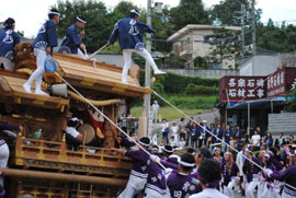 ツアーは、桜井神社での見学のあと、黄金色に染まる田園風景の中を歩き、法道寺・国神社へ向かいます。ここでは泉田中のだんじりの巡行と、先ほどの「こおどり」の一行が合流し、だんじりと踊りの迫力ある掛け合いが始まります。