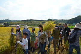 この事業は「旧村とニュータウンとの地域交流」を目的に実施しており、今年で3年目になります。当日は天気にも恵まれ、清々しい秋晴れの中、66組(196人)の家族が稲刈り・サツマイモ掘り・枝豆取りを体験しました。