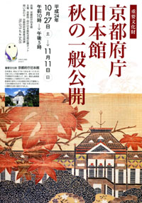 10月27日から11月11日まで「秋の一般公開」です。春は桜の下での賑わい、秋は芸術・展示に、ステージも多彩。新しい参加の場になっています。展示では、布と同じ工程・染料で杉板に表現する技術、ステージでは学生のおどり「京炎そでふれ」、無声映画と放送劇団の共演などなど。文化財資産は物的な空間・建造物が、無形の技を智恵で結ぶことで、現代に、活きてきます。