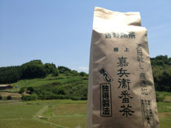 その次に、これらのスイーツに入っている番茶が生産されている「嘉兵衛本舗」さんのところへ向かいました。初夏の青空の下、茶畑の緑が美しい里の風景が広がっています。この景色の中で生産される番茶が美味しいスイーツとなって多くの方の舌を楽しませているのですね。