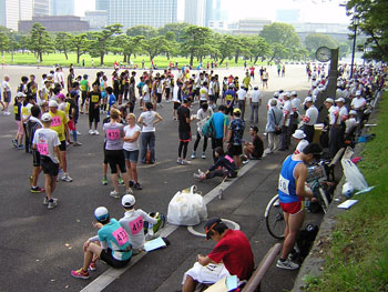 千代田区の調査によると皇居コースを走る一日のランナー数は平日で約7,500人、休日には約9,000人にもなります。周辺で働く人が仕事の後に走ったり、外国人も含めたランニング観光客も多いのですが、実は一番多いのが競技会などのイベント参加者です。競技会では桜田門前広場などが集合場所として利用されることが多く、平成23年度には利用申請ベースで年間300件弱、参加者は70,000人弱にもなりました。