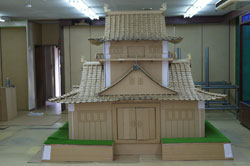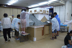 幻の三田城の復元では、地元の建築家が図面を起こし模型・試作をつくり、地元の段ボール事業者から段ボール板を300枚無償提供いただき、子どもと一緒に仕上げを行いました。