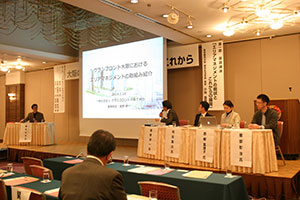 後半は、嘉名光市先生(大阪市立大学)をコーディネーターとして、グランフロントの大規模開発や梅田全体のエリアマネジメントに取り組んでおられるグランフロント大阪TMOの廣野研一氏(三菱地所株式会社)、規制市街地におけるゆるやかなエリアマネジメントに取り組んでおられるミナミまち育てネットワーク設立の立役者の和田真治氏(南海電気鉄道株式会社)、高松丸亀町商店街の小規模連鎖型再開発をコーディネートされている西郷真理子氏((株)まちづくりカンパニーシープネットワーク)、全国初の都市再生整備推進法人で札幌大通り地区を舞台にまちづくり貢献事業を展開されている服部彰治氏(札幌大通りまちづくり株式会社)の面々による白熱したパネルディスカッション。当日は、時間が足りないくらい充実した現場での知恵や工夫、そしてまちづくりへの熱い想いが会場一杯に拡がりました。