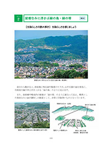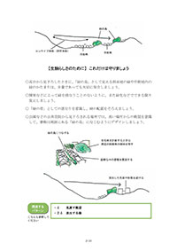 それぞれのパターンの中にある生駒らしさを写真やスケッチによって解説し、それを活かしてどのようなことに取り組んでいけば良いのかを示しています。これらのパターンを単語として文章のように組み合わせてデザインすれば生駒らしい景観づくりが実現できるというしかけです。その道筋をいくつかの計画例として解説しています。