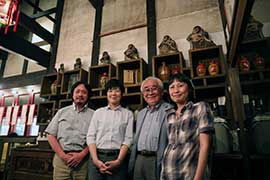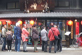 実は、この店は、三輪さんの生まれた家で、明治29年(1896)分家したお祖父さんが建てました。本家は禁裏御用を勤めていた本田味噌本店です。姓は三輪ですが屋号は本家と同じで、その本田商店の「味噌」という看板、年代物の家具や布袋さんも残しています。築118年の京町家と中華料理のミスマッチ、抜群の味が評判で、開店前からご覧のような行列です。