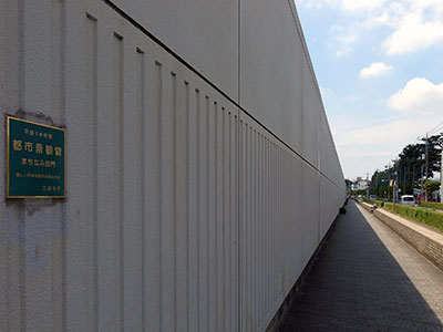 「都市景観賞」と表示されたプレートが塀に埋め込まれています。この賞は府中市の景観条例に基づいて与えられる賞です。調べてみると、事件当時の塀は撤去され、その内側に現在の塀が設置されたようです。歩道に設置されているベンチは古い塀の一部を利用したものだそうです。植栽なども整備されて全体的に明るい感じになっていますが、それにしても刑務所の塀が都市景観賞ですって。