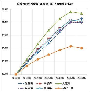 前号(No.187)の「その7」では、介護問題を視野に入れ、例示的に90歳以上の将来人口を紹介して、その急増傾向と地域によっては一層激しく増加することを指摘しました。今回は、さらに一歩踏み込んで、関西(2府4県)における介護需要の急増ぶりを具体的に推計し、その対応の難しさを考察してみます。