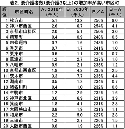 前述のように府県によって将来の介護需要は異なりますが、これを市区町村ごとにみると、より一層介護需要が急増し、それへの対応が厳しい市区町が鮮明になってきます。例えば、要介護3以上の要介護者数の2010年から2030年にかけての増加率を、府県と同様の考え方で試算すると、増加率の高い上位20市区町は表2のとおりです。最も増加率の高い枚方市では、2.5倍以上、約8千人の増加が試算されます。以下、神戸市西区、京都市山科区、精華町、四條畷市などが続いています。全体として、バブル崩壊後も比較的堅調に人口を増やしてきた市区町が並んでいます。前述の大阪府について指摘した特養の新設需要や、居宅サービスのマンパワー確保が、より一層強く求められることになります。
