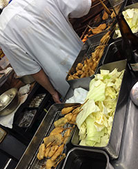 串カツは人気の牛串1本100円から若どり1本160円など約15種類。注文して熱々揚げたてを食べるのが一番ですが、冷えてきたものは再度温め直してもらうこともできます。当然のことながらソースの二度づけは禁止。串を持つ手が油でべとべとになったら目の前に吊ってある濡れ布巾で手をふきます。最後に串の数(値段によって串の種類が違う)を数えてお勘定。ビールも飲んでお腹も満足して1人千円から2千円くらい。