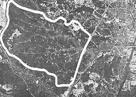 ![]() 用地取得前の会場予定地(白線内が万国博会場となった) 写真出典:日本万国博覧会と大阪市 |