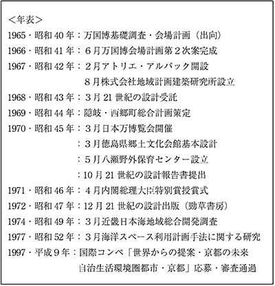 3月15日、審査をパスした「関西グループ」の編制は、西山夘三教授を責任者とし、総括班12名、計画設計班12名、調査研究班51チーム207名。3月20日、受託機関として株式会社地域計画建築研究所は、内閣審議室と契約を結びました。「21世紀の設計」は、3ヶ年継続事業で、1970年10月31日、報告書提出。翌71年3月1日、審査結果が発表されました。4月23日、首相官邸で表彰式が開かれ、完了しました。