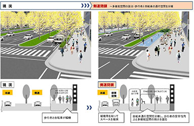 こうした状況に対し、大阪市は「グランドデザイン・大阪」「大阪都市魅力創造戦略」で御堂筋を世界に誇る都市魅力を発揮できる舞台として、顔に相応しい賑わいのある空間へ再編を図る方向を打ち出し、平成26年10月に側道を閉鎖し歩道を拡げるとともに自転車通行空間を確保するという具体的な空間再編案を発表しました。