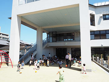 新園舎の特徴は、まず本堂との調和を考え、元の園舎に高さ、雰囲気を合わせたということでした。2つ目は建物と地面を最大限利用できるようにすることで、屋上の積極的利用や3階にピロティを張り出したことによる地上の園庭確保、また保育スペースとしても利用できる廊下の設え等が挙げられます。3つ目は将来のこども園化への対応で、乳児室を3階に設けること等を行っています。