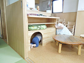 0歳児用の園舎ということもあり、設計する上で特に安全のための気遣いが求められました。また、敷地条件的にあまり大きな建物とすることは出来ず、小さいからこそ厳密な設計が求められました。トイレ内の配置に関しても打合せ中に園長先生はじめ0歳児担当の先生も一緒に原寸大で考えながら検討しました。