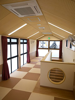 光林保育園はお寺の中にある保育園です。打合せ等で何度も通っているうちに、お寺という環境で遊んでいる子ども達にとって、この環境は家とは異なるもう一つの原風景となるのだろうと思うようになりました。このため、0歳児棟からもお寺を感じる事が出来る空間としたいと考え、2階に上がると正面に山門の鬼瓦が見え、ハイサイドの窓からは庫裏の大屋根が広がるように考えました。