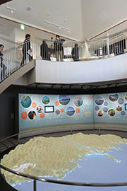 豊岡市の北に位置し山陰海岸国立公園の中にある竹野海岸は、山陰海岸の中でも美しい砂浜と海水を誇り、世界ジオパークネットワークへの登録を機に来訪者が増加しています。竹野では、これらのエリアをフィールドにしてジオカヌーやスノーケル、海上タクシーや遊覧船など様々なアクティビティへの誘導が重要な位置を占めるようになり、この度、既設の北前館をこれらの拠点施設として位置づけ、展示施設のリニューアルを行いました。直径5mの模型に照らし出されるプロジェクションマッピングでは、山陰海岸の成り立ちや歴史、竹野の生活や文化をわかりやすく紹介し、周囲の展示と連動させながら、空間的に竹野ジオエリアを体感できる施設となっています。