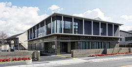 基壇となる1階は、1枚1枚手仕事で組み上げた杉板の木目を浮き立たせるようなコンクリート打放しとし、2階には10cm角のタイルを格子状に張ることとによって、伝統的な格式を表現しています。