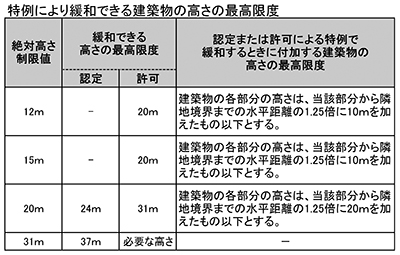 次に、敷地面積が3,000㎡以上の敷地で相当のセットバックを行い、グリーンチェーン認定をレベル2以上に適合し、相当の敷地内緑化を図っているもので、周辺環境への調和と市街地環境の維持に大きく貢献するものについては、市は許可により、12m又は15mから20m、20mから31m、31mから「必要な高さ」(「高度地区の規定書」)まで緩和できるとした。